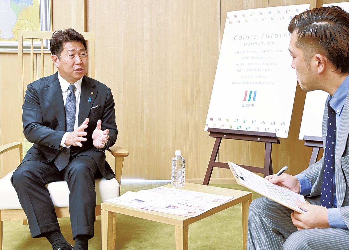 「この10年、スピード感を持って取り組み、まちの風景も制度も随分変わったと思います。例えば、看板政策だった中学校給食の導入は喜びの声を多くいただきましたし、待機児童対策も3年連続でゼロを達成できました。小児医療費の助成も段階的に増やしてきました。新型コロナにより市民との交流が途絶え、影響を及ぼした面もありましたが、一段落した今、誰もが安心して住み続けられるための地域包括ケアシステムの構築が重要と考えており、着実に進めていきます。一方で、課題の一つは産業構造の変化です。川崎市はこれまで京浜工業地帯の一角を担い、CO2を排出して成長してきましたが、今世界は脱炭素の時代です。鉄鋼大手・JFEスチール東日本製鉄所の高炉が昨年9月に休止し、まさに今年は『脱炭素のまち川崎』として新たな方向へと歩む元年になる気がしています。引き続き、新鮮な気持ちで緊張感を持って取り組んでいきます」