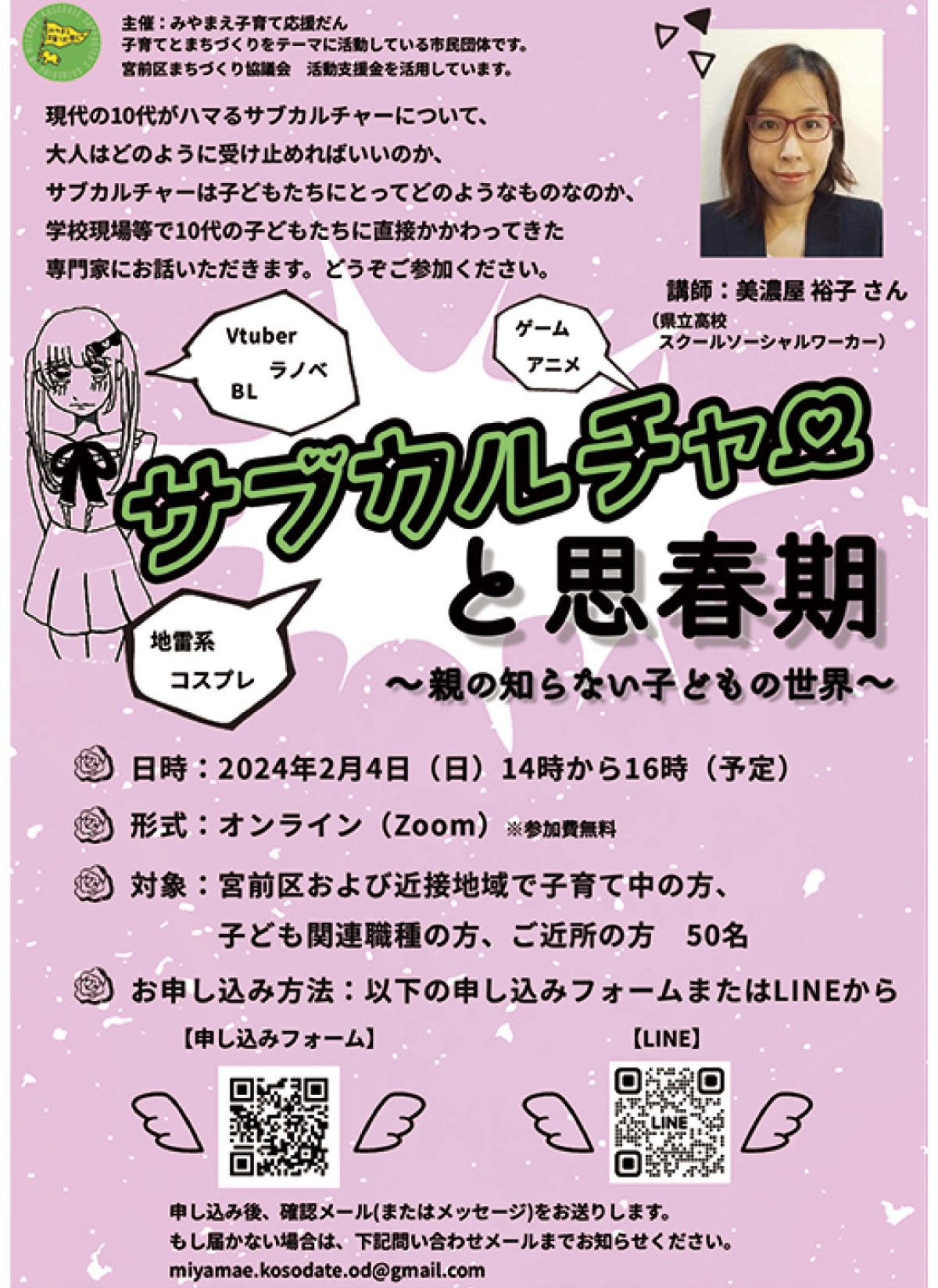 子育て応援コミュニティ「みやまえ子育て応援だん」が主催する公開勉強会「サブカルチャーと思春期」が2月4日(日)、オンライン(Zoom)で開催される。午後2時から4時まで。参加費無料。