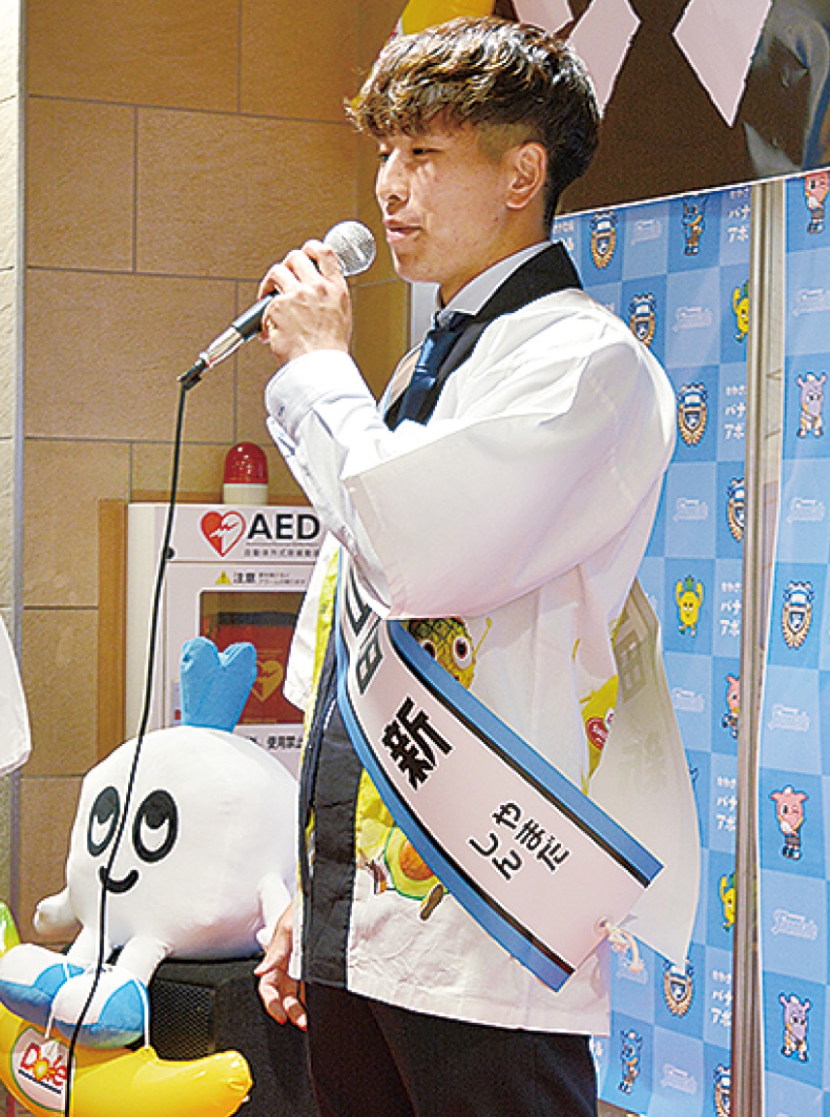 川崎フロンターレアカデミー出身で、3、4年生の頃を西有馬小学校で過ごした山田新選手(23)が、さぎ沼商店会(菅原一夫会長)を担当。サポートショップなど7店舗を回り、サインや握手をするなどしてサポーターと交流した。