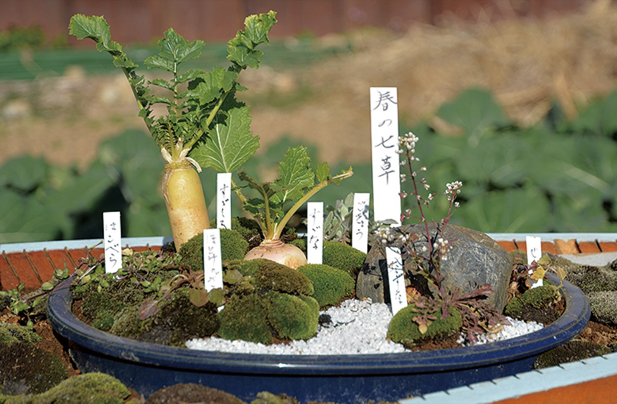 初山在住の萩原明さん(83)=人物風土記で紹介=が育て、集めてきた「春の七草セット」。近隣住人は例年、正月飾りとして鉢植え=写真=にしている。