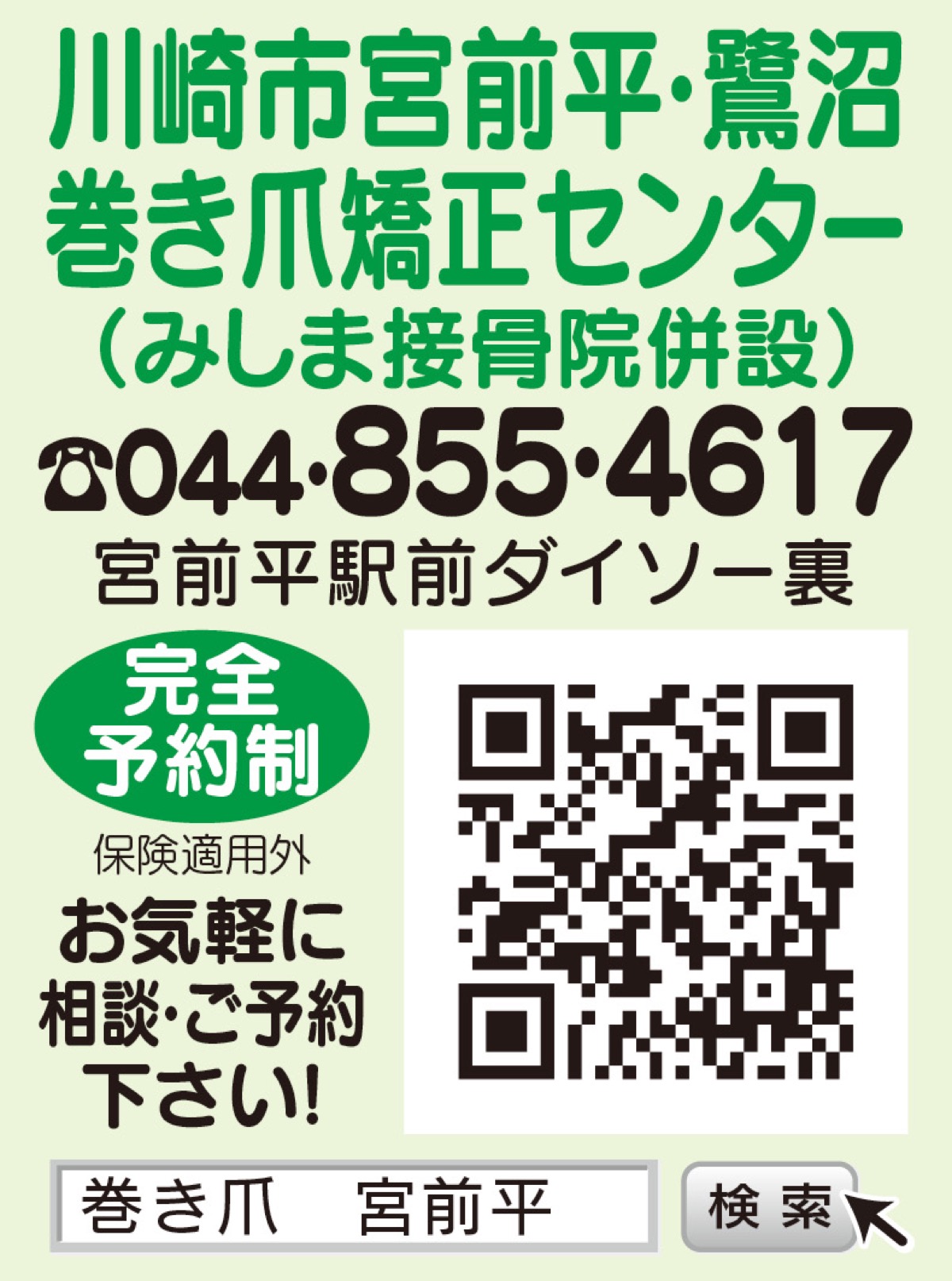 痛い巻き爪の悩みは川崎市宮前平・鷺沼巻き爪矯正センターへ。同院は、現役外科医考案の「ツメフラ法」という心臓手術にも使われるステントと同素材の矯正具を使用。「短期間で安全に矯正でき多くの方が初回で効果を実感されています」と三島院長。左記二次元コードから、改善症例や施術法の詳細等をチェック!