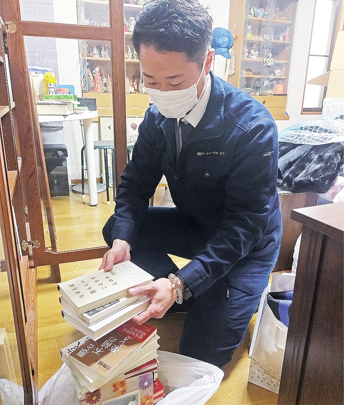 依頼後、対象の家屋に出向き、生活用品や思い出の品を手早く整理していく。本は1冊ずつめくりながら中を確認。不用品は買取やリサイクルに出すこともある。状況次第だが一軒家であれば2日ほどで完了させる。
