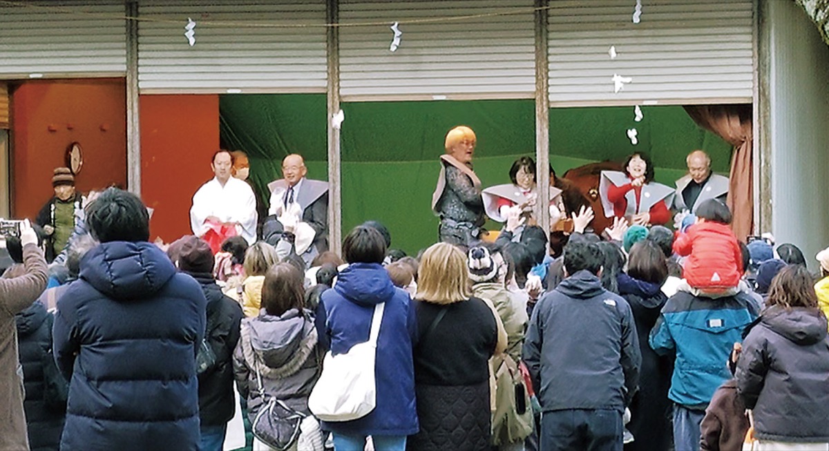 昨年復活した豆まきでは、12歳を含む、計12人の年男・年女が境内に豆や餅、菓子をまいた=写真。地元住民が約100人集まり、1年の無事を祈った。境内には大太鼓も設置され、来場者が打ち鳴らす姿も見られた。