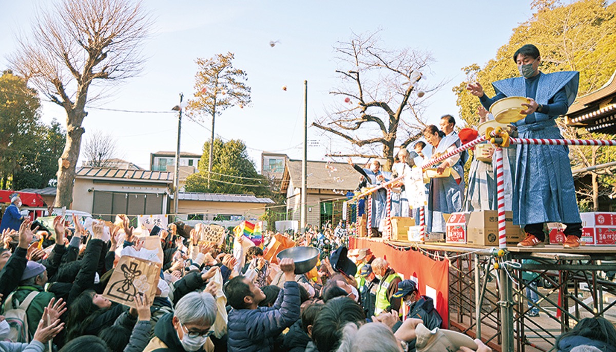 4年ぶりとなった豆まきには、今年の干支・辰年生まれの「年女・年男」が参加。裃とはかまを身に着けた参加者は、境内に設置された特設ステージ、神楽殿、トラックの荷台の3カ所に立ち、来場者に向かって豆、餅、菓子などをまいた=写真。来場者は手や袋を上にして、「福」をもらおうとしていた。