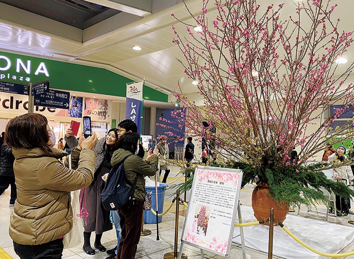 市の花卉栽培技術には定評があり、今年1月の「第72回関東東海花の展覧会」では、「花卉部馬絹支部」の支部員の技術が高く評価され、農林水産大臣賞を受賞。今回、その花桃を駅の中央口通路に設置した巨大な花瓶に活けて展示した。