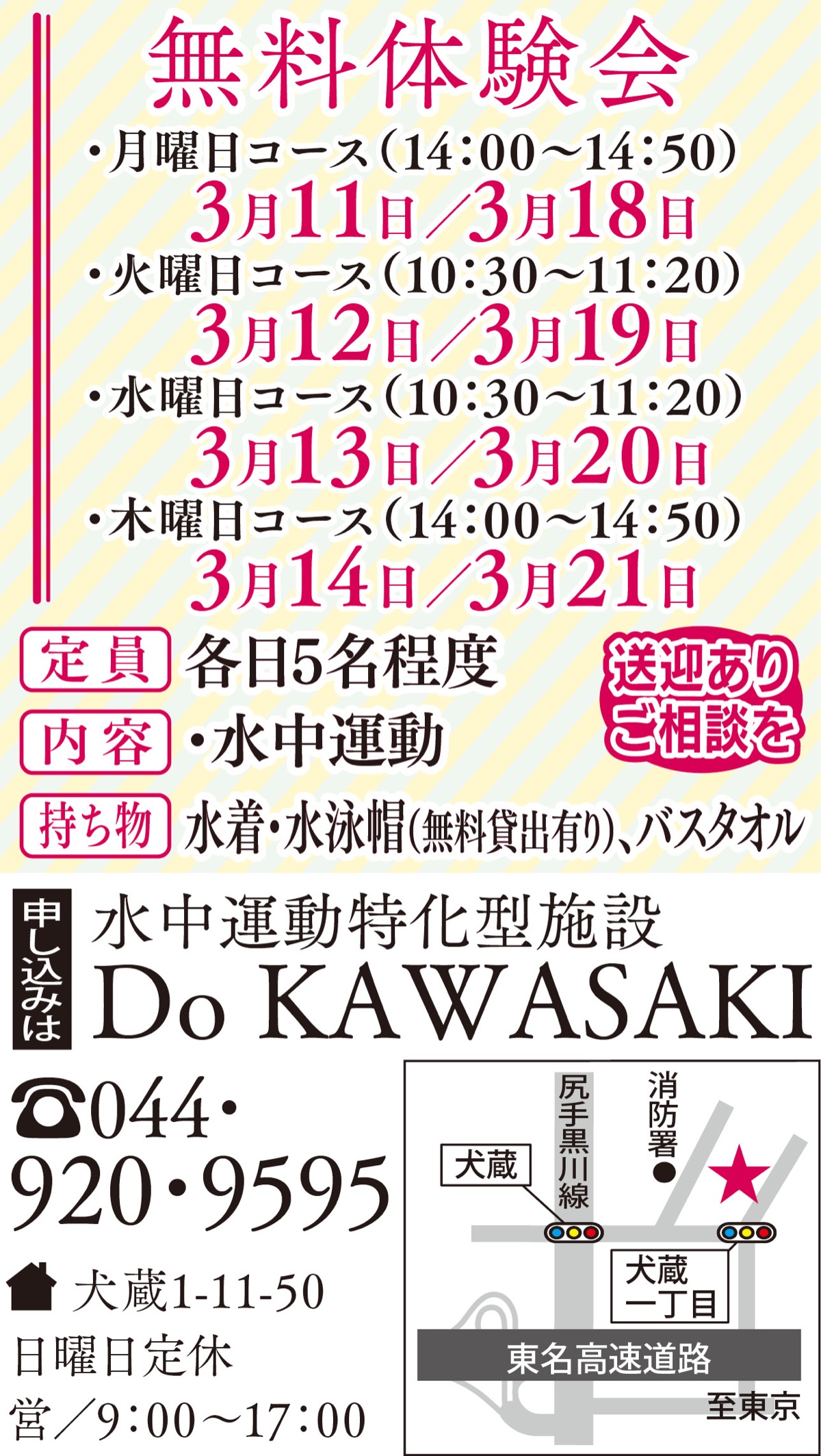 区内 犬蔵にある中高年のための水中運動特化型施設「Do KAWASAKI(ドゥ カワサキ) 」がこの3月、月曜日から木曜日に「水中運動無料体験会」を実施する(詳細は下表)。
