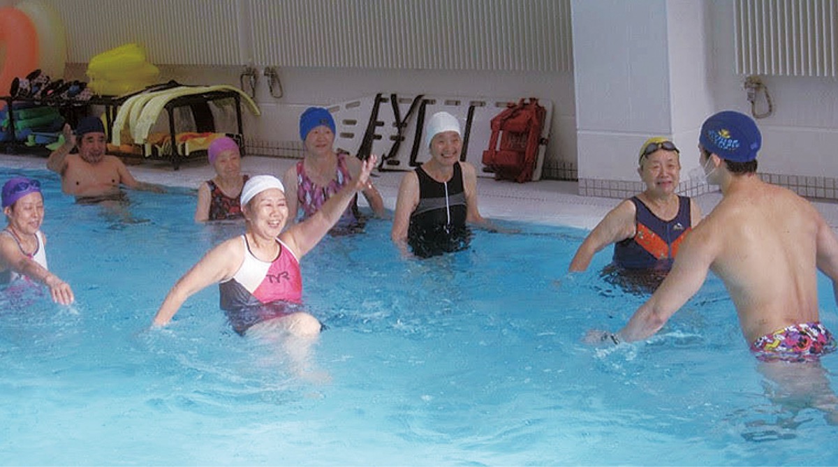 これは、年齢と共に低下するといわれる体力や筋力の回復を目的としたもの。同施設では膝痛や腰痛等を抱え、陸上では運動したくてもできない人が、安全で楽しく効果的に筋力・体力の向上を図れる「水中運動」という方法を実践。水圧により血行、むくみ、血圧の改善も見込まれ、自然な腹式呼吸ができるため、呼吸循環機能の向上なども可能だという。