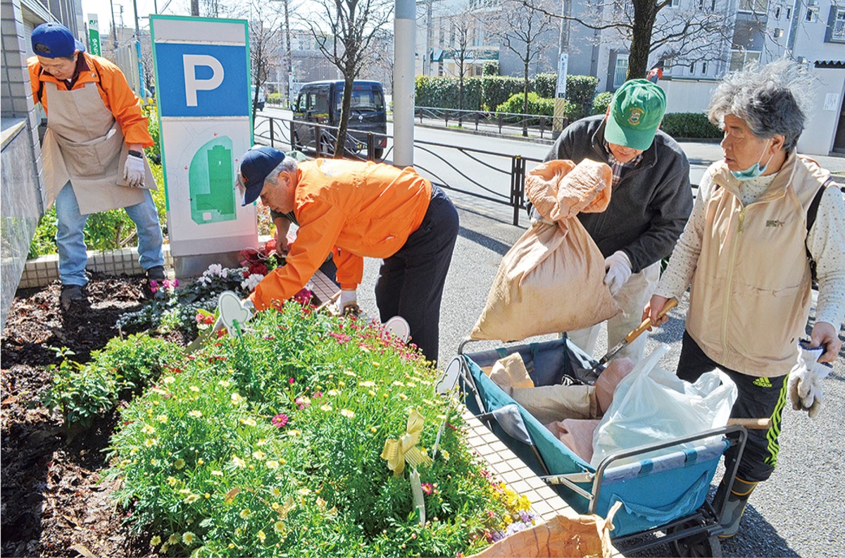 15日は土づくりとして、花壇の土壌表層に落ち葉をかぶせる「落ち葉マルチ」を同町会のメンバーが実施。落ち葉は微生物のはたらきで発酵、分解が進み、土壌の栄養分となる。しばらく落ち葉を置いてから、今後、花苗を植える予定だ。