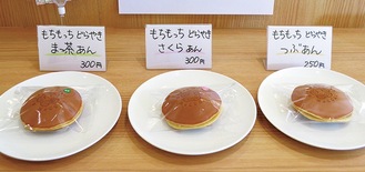 秋まつりでの好評を受け「地域でも販売したい」と更なる展開を模索した2組の児童。その声を受け、同店がコラボ商品を販売することとなった。定番の「つぶあん」に加え、春らしく「抹茶あん」「さくらあん」を用意。生地は児童が考えたレシピを基に白玉粉を配合し、もちもちの食感を表現している。表面には同校オリジナルの焼き印を添えた。