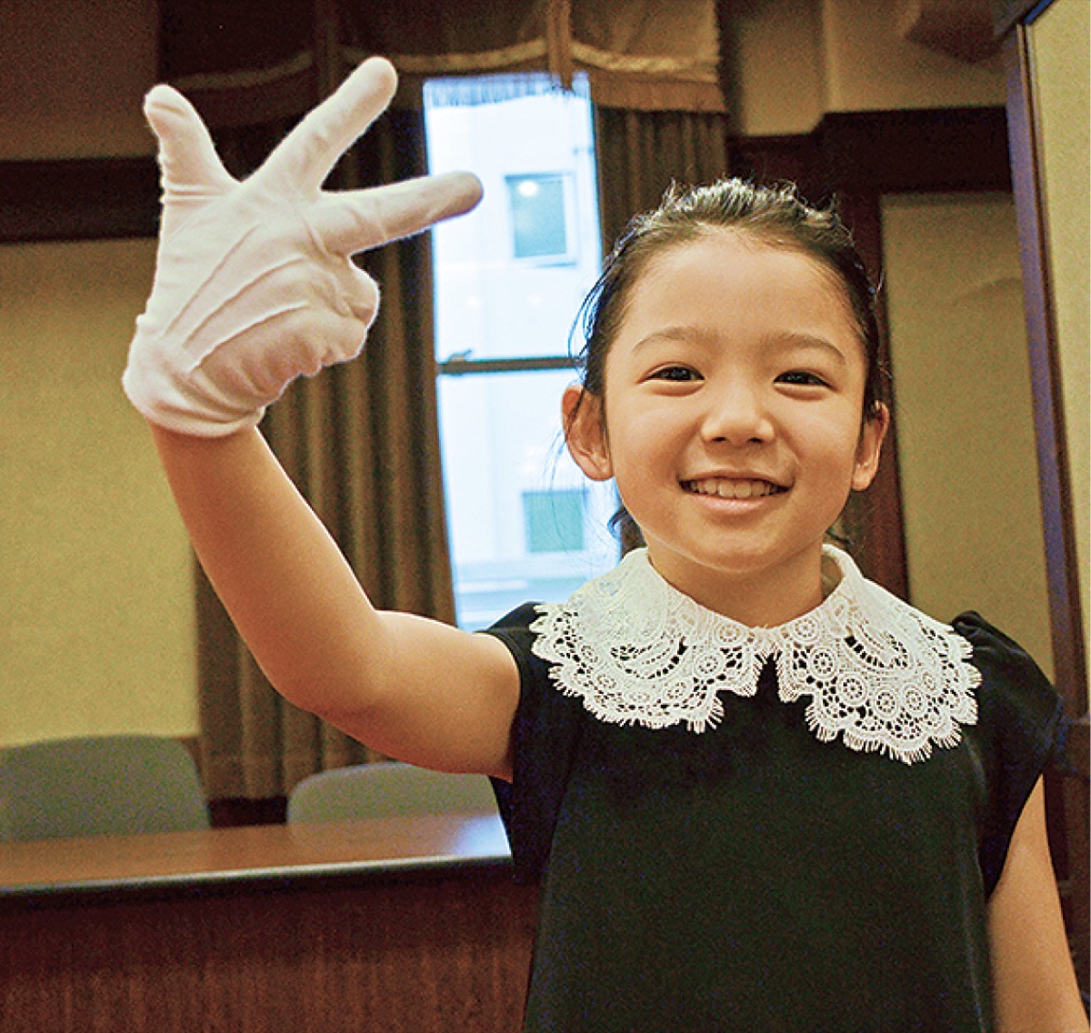合唱団に県内から唯一参加するのが照井さんだ。サイン隊に所属する照井さんは小1から活動し、仲間とともにパフォーマンスを磨いてきた。県庁の演奏では初めてのソロに挑戦。「手話を覚えるのをがんばった。楽しかった」と声を弾ませた。好きな手話はオリジナル曲『にじふらい』に登場する数字の7。弧を描くと「虹」の意味になる。