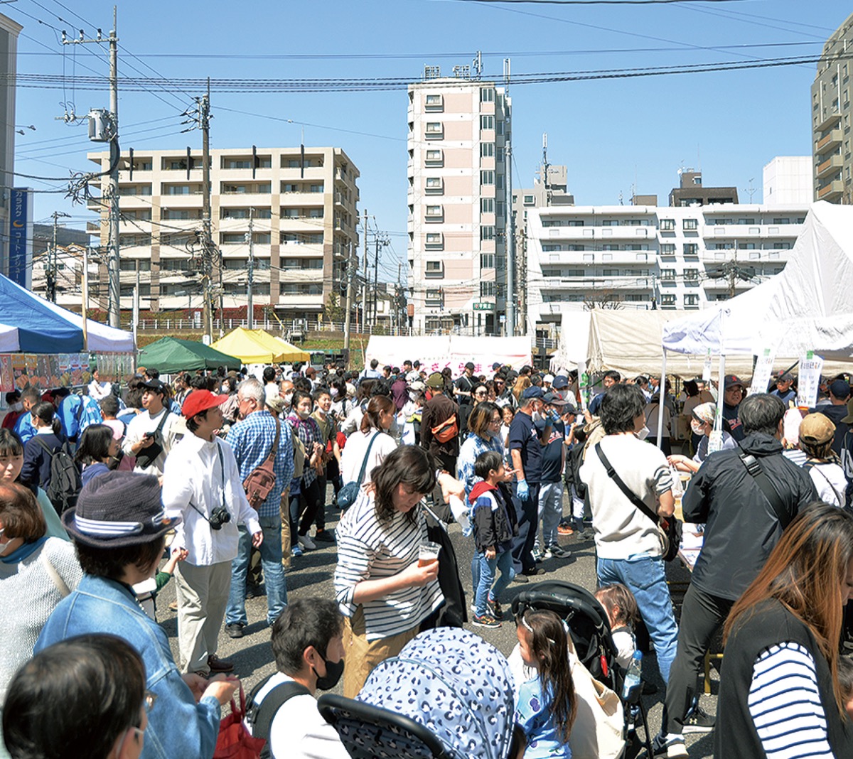駅前から続く「春待坂」は、桜並木が続くお花見スポットして知られる。当日は多くの人が駅周辺を訪れ=写真、フードコートや特設ステージで披露されたダンスや音楽などを楽しんだ。