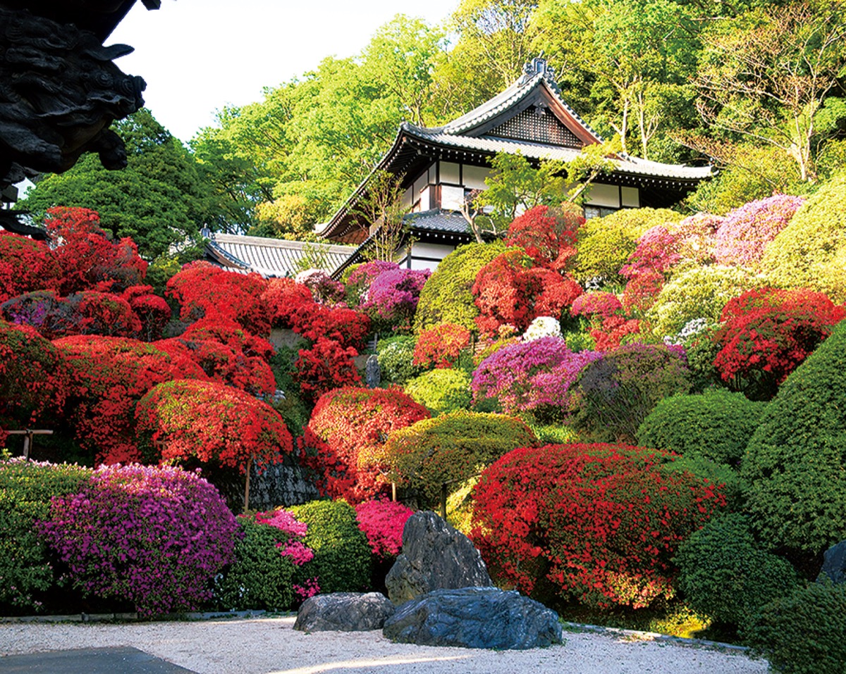 19日には、正面階段両脇で赤やピンクなど艶やかなの色のツツジが咲き乱れた。カメラを手にした参拝者も多く、今年の花景色を楽しんでいた。同院には、約2000株のツツジが植えられているという。