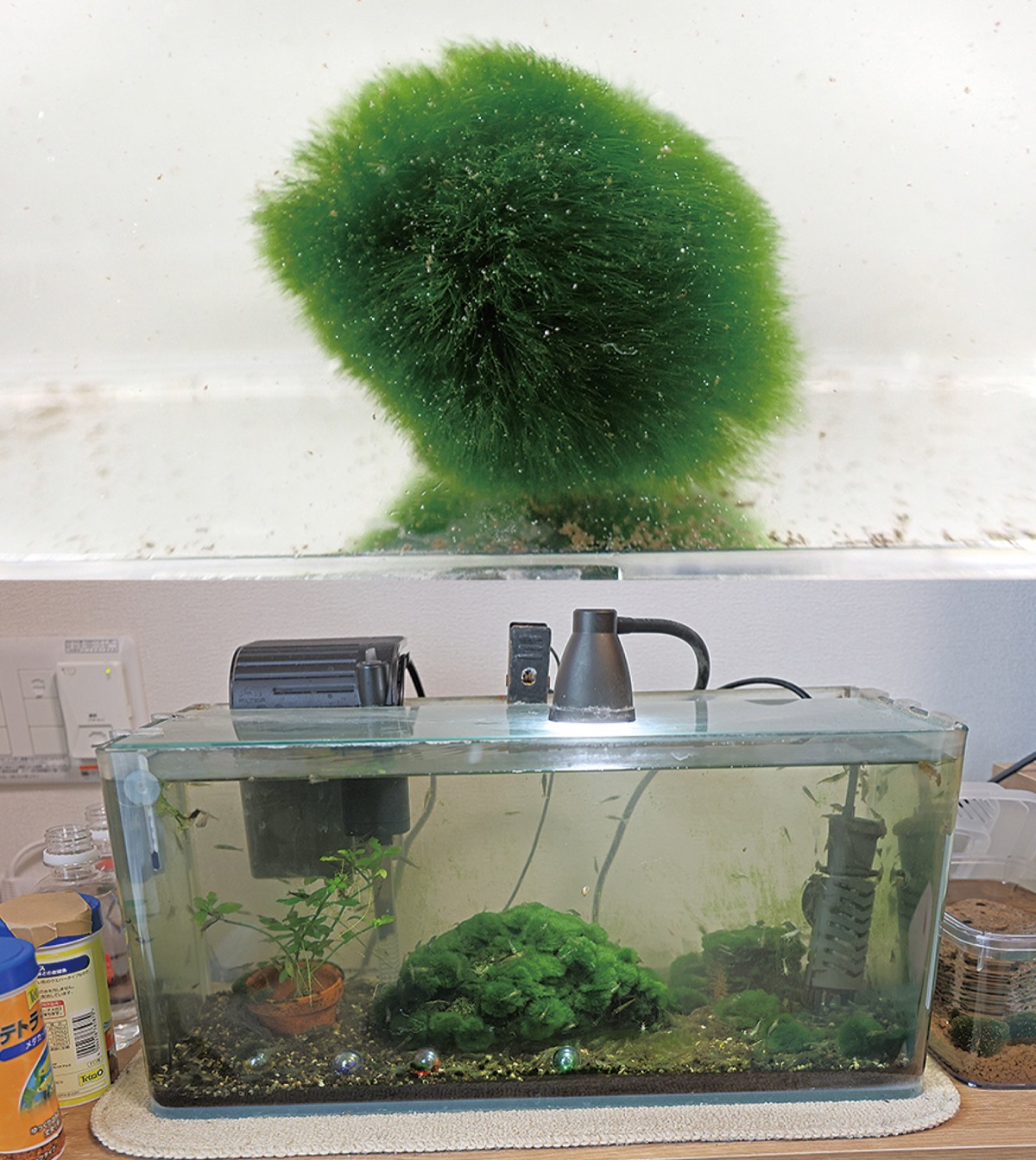 そんな問い合わせが国立科学博物館に届いたのは、今年の元日。公式サイトの「問い合わせフォーム」に、写真とともにメールで送られてきた。送り主は川崎市内の男性で、2021年7月に新しい水槽を立ち上げ、多摩川の河原で底に敷く石を採取していた。そして、2年後の23年6月には、石の表面に緑の毛がふさふさと生えた状態で、「まりも」のような球体が石からあふれ出るようになった、という。