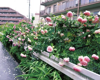 かつて不法投棄のごみや雑草であふれていたこの川沿い。10年ほど前から、近隣に住む主婦たちが協力し、バラを中心とした花壇づくりを進めてきた。「ゴミを出さない」をモットーに、農薬や肥料を使わず、微生物の働きで作る落ち葉堆肥を活用している。