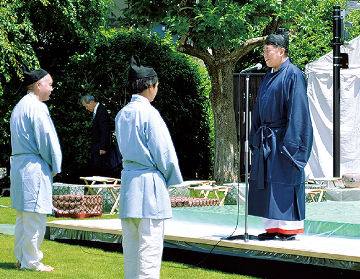 式典後には、公益社団法人北之台雅楽アンサンブルが雅楽「賀殿(かてん)」を上演。建物新築の際に用いられることが多い楽曲といい、赤系統を基調とした襲(かさね)装束の舞人や演奏で、華を添えた。