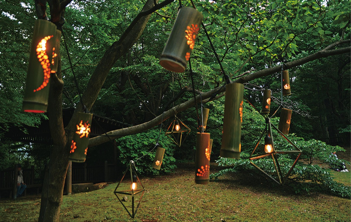 竹灯籠のライトアップは、持続的な竹林と里山保全に取り組む「かわさきあかり」と専修大まちづくりDXラボが手掛けた。竹林整備で伐採した竹で100個の灯篭を制作し、会場を幻想的に演出した。