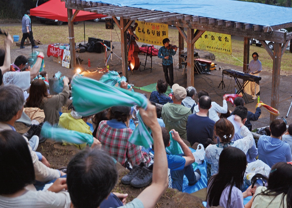 とんもり谷戸の一角にある「おもい出のうたのこみち」には、昨年を上回る約300人の観客が集まった。かがり火や竹灯籠が会場を照らす中、観客は16回目の出演となる音楽ユニット「style-3!」の演奏を楽しんだ。