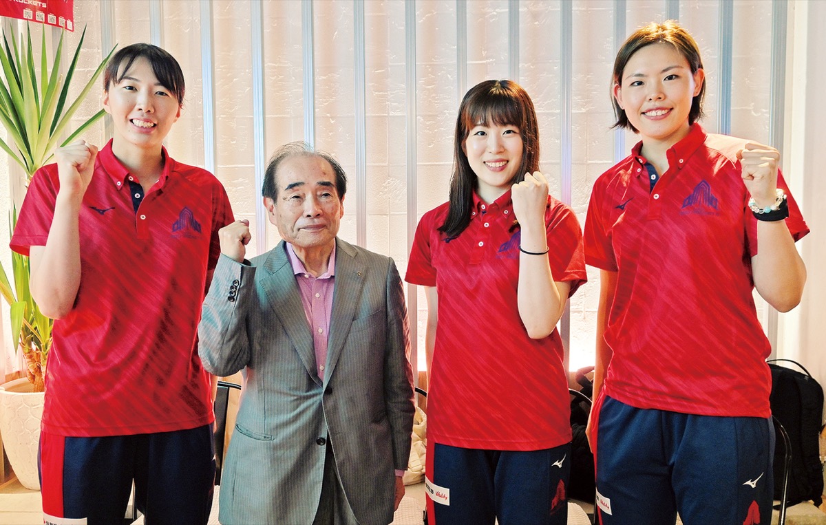 バレーボールⅤリーグ女子を2連覇したNECレッドロケッツ川崎の甲萌香選手、島村春世選手、田中瑠奈選手が5月27日、後援会(田中徳一郎会長)主催の優勝祝賀会に出席し、新シーズンに向けて抱負を語った。