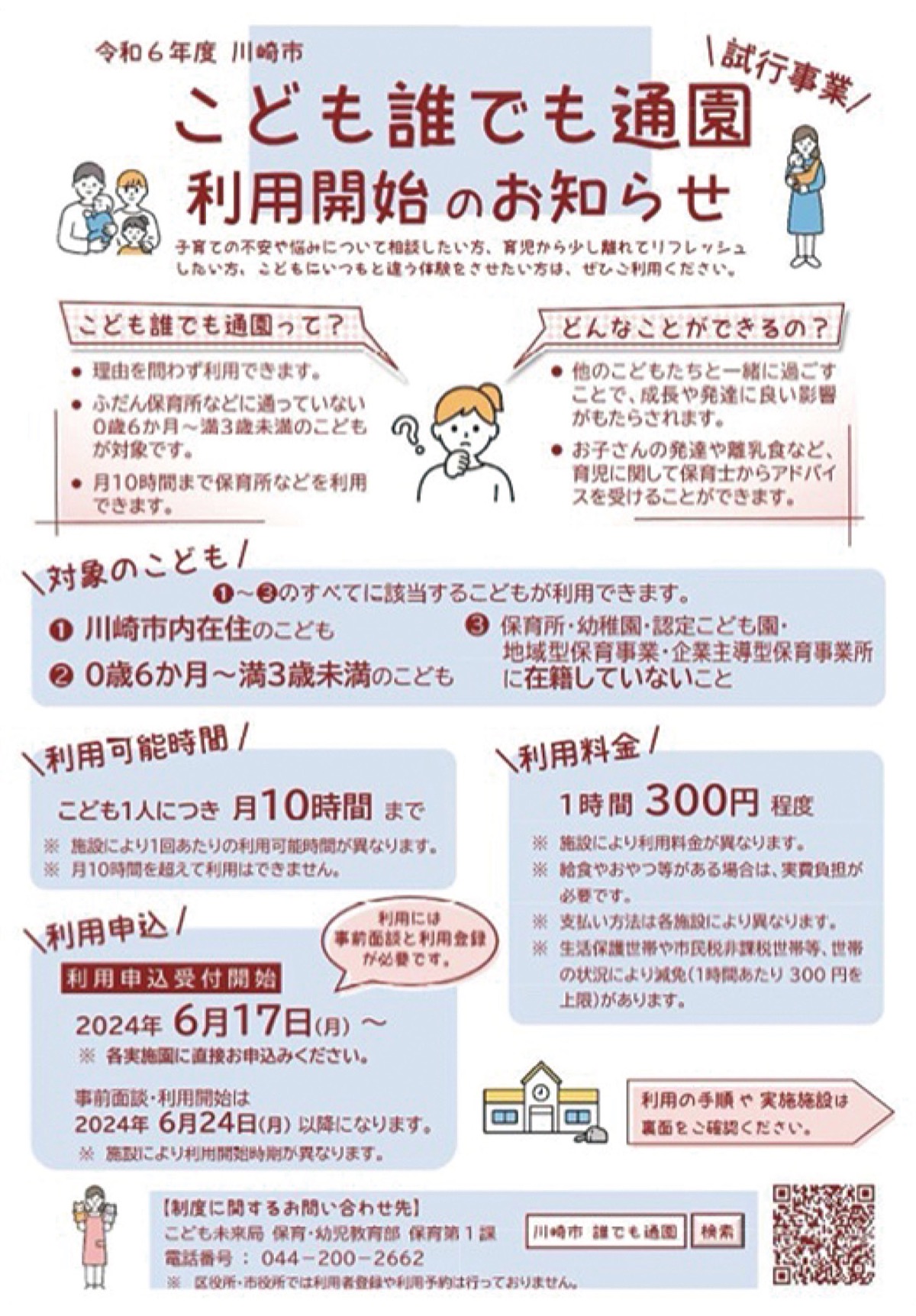 川崎市は6月24日から、親の就労の有無に関係なく子どもを保育所などに預けられる国の新たな制度「こども誰でも通園制度」の試行実施を始める。これに先立ち、6月17日から市内45の実施施設で利用申し込み受付を開始した。