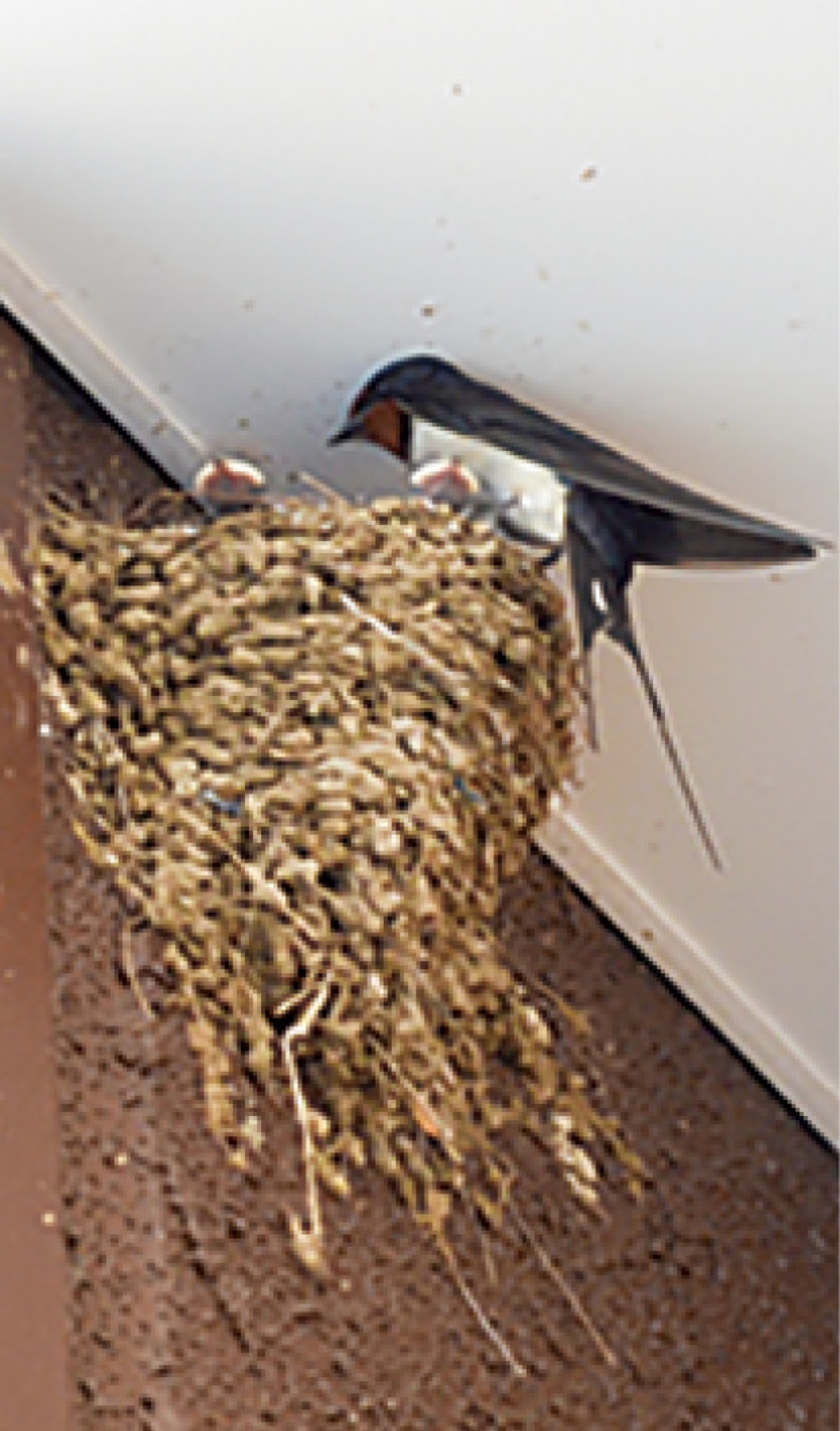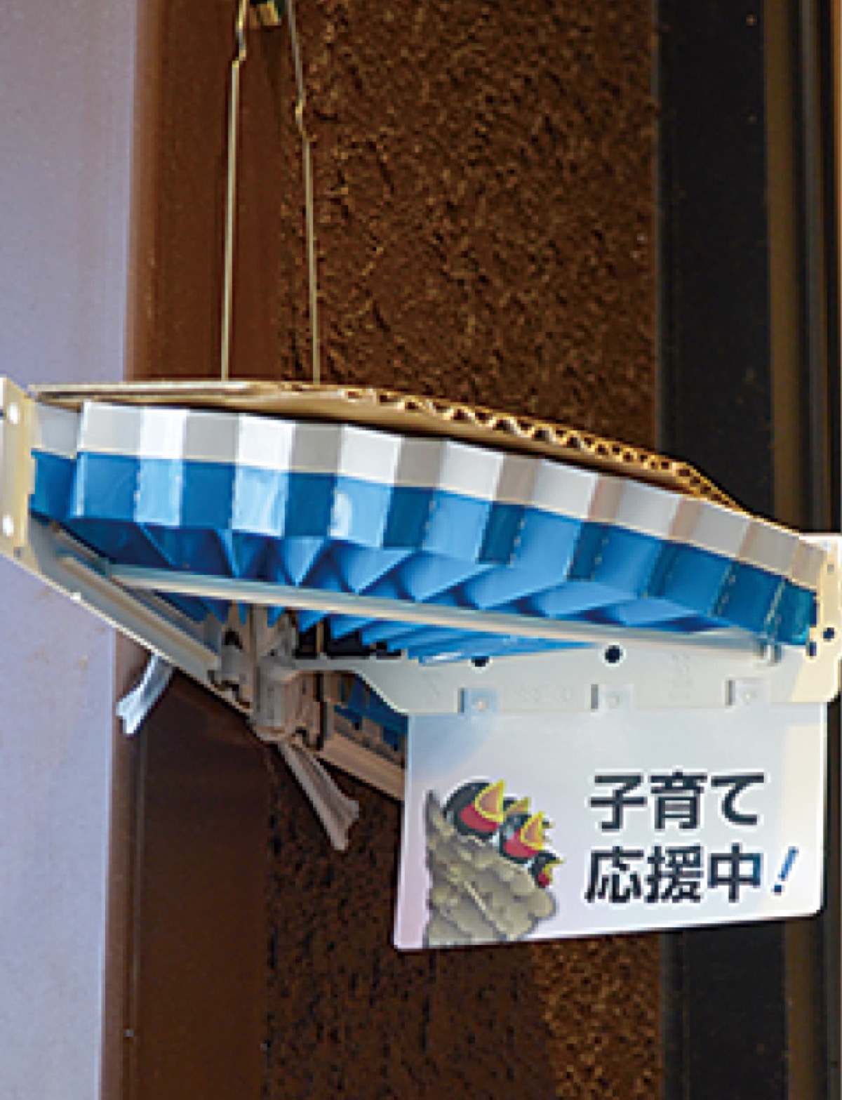 同店が最初に巣を発見したのは5月3日。ヒナが大きくなると、巣の下にフン受けを設置した。「子育て応援中!」のボードも付け成長を見守る。担当者は「お客様からは『楽しみ』という声も。人が集まるきっかけになったと思う」と語る。
