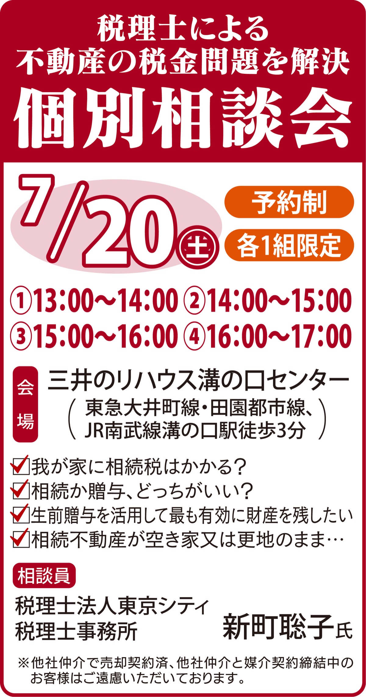 溝の口駅徒歩3分の三井のリハウス溝の口センターで7月20日(土)、専門税理士を招いた個別の無料相談会を開催する。