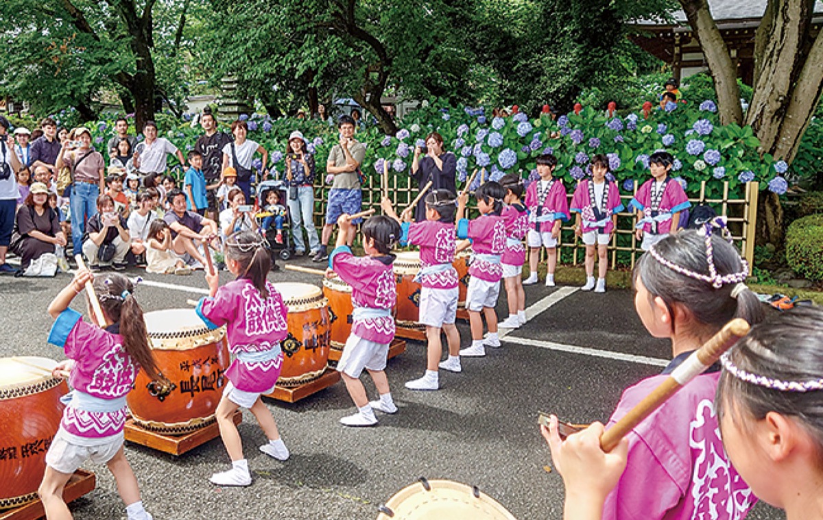 長尾の里あじさい保存会の井田光政会長は「前日の雨で、あじさいは生き生きして笑っているように感じる。妙楽寺を始め、多くの協力者に感謝する」とあいさつ。実行委員長を務めた井田良一さんは「天候に恵まれ、野点や各催し物をゆっくり楽しみながらあじさいを愛でていただきたいと」話した。毎年訪れているという親子は「天真爛漫な長尾子供太鼓の演奏に毎年心を洗われる」と話していた。