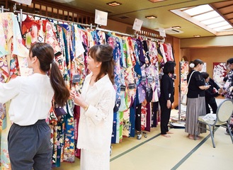 展示会には2日間で、2025〜27年度に二十歳を迎える15組が来場した。会場には赤や紺などの色鮮やかなものから、近年人気の淡い色合いのものまで100着以上の振袖を展示。両親や祖父母と訪れた来場者は、スタイリストのアドバイスを受けながら、和やかな雰囲気でお気に入りを選んでいた。