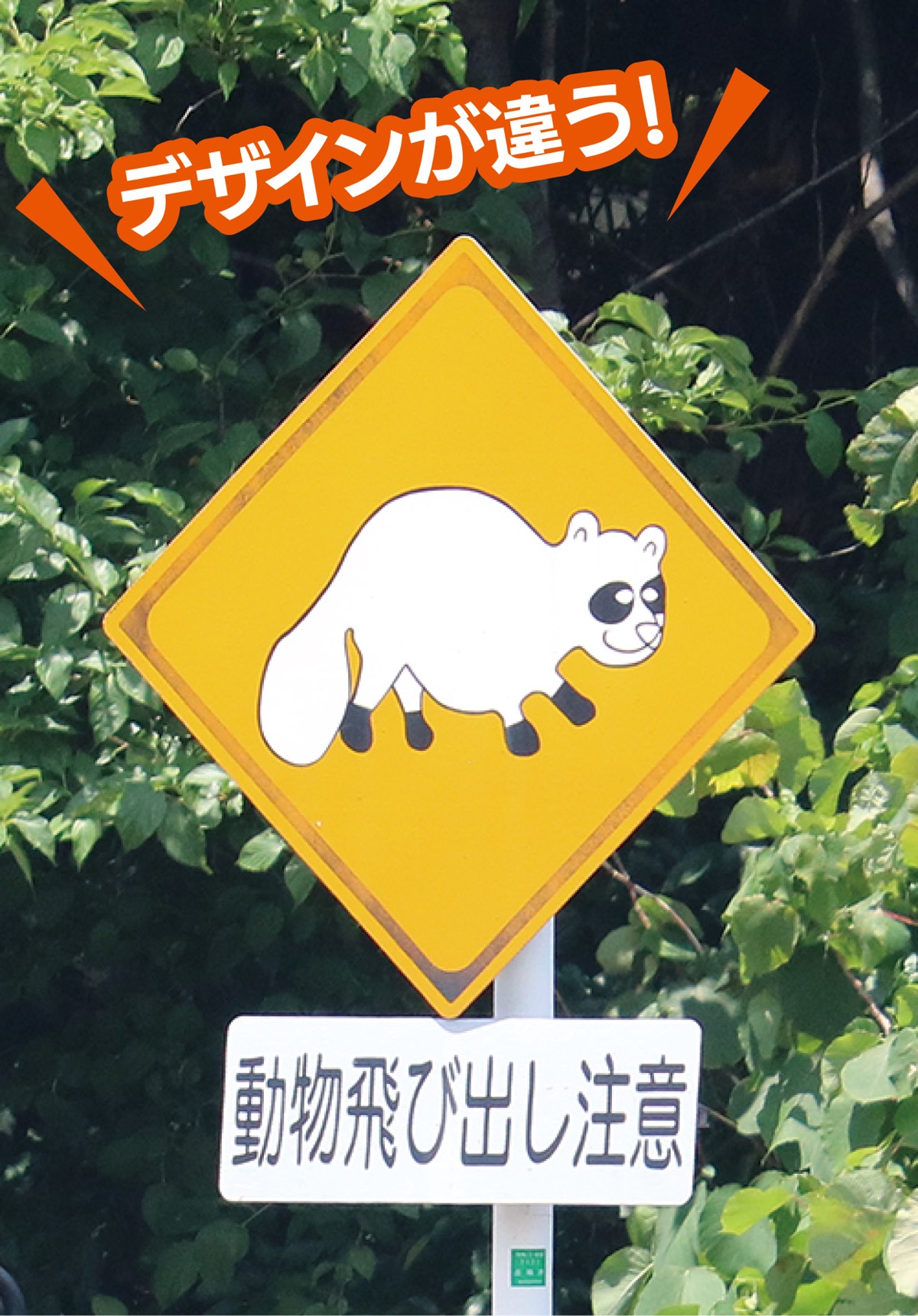 標識のデザインは川崎市が設置したものは統一。だが設置主体によってデザインもさまざま。国道246号(高津区津田山陸橋交差点付近)にあった標識は、なんと白いタヌキだった=写真【3】。文言も動物「飛び出し」注意となっていた。