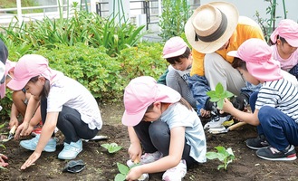 手ほどきを受けながら苗を植えた5歳児たち。玉利詩織さんは「初めはうまくできるか緊張したけれど、上手に苗を植えられてうれしかった」。陶山敬祐くんは「僕たちのクラスはひまわり組という名前だから、ひまわり組がひまわりを植えられるなんて面白くて楽しいと思った」。田中瑠璃さんは「苗を土の中に入れた後に、大人の人と一緒に土をかぶせて固めたことが楽しかった」とそれぞれ感想を話した。