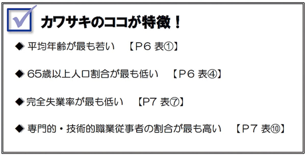 最新の「カワサキをカイセキ!」によれば、まず「人口」の面から見た川崎は「若さ」や「活発さ」を印象づける。平均年齢が43・7歳と最も若い一方で65歳以上の人口割合が20・2%で一番低い。15歳以上の人口に占める労働力人口(労働力率)は東京都区部に次ぐ2位で、完全失業率は3・3%と最も低かった。自然増加数が福岡市に次いで高く、出生率は3位で、婚姻率も東京都区部に次ぐ2位だった。