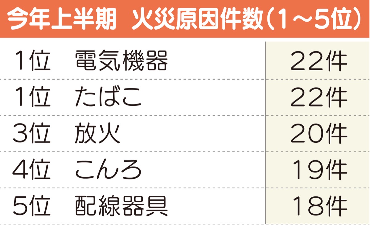 川崎市消防局は7月30日、今年上半期の市内火災件数を発表した。電気火災が61件(速報値)で過去10年の平均39・2件を大幅に上回っていることがわかった。特にリチウムイオン電池に起因する火災が前年よりも増えており、気温が上がる夏季の使用、取扱いに注意を呼び掛けている。