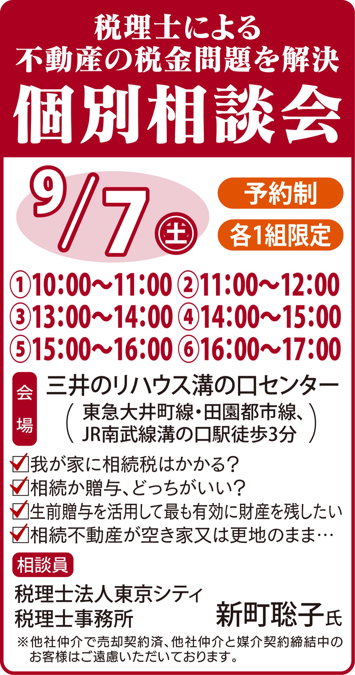 溝の口駅徒歩3分の三井のリハウス溝の口センターで9月7日(土)、専門税理士を招いた個別の無料相談会を開催する。