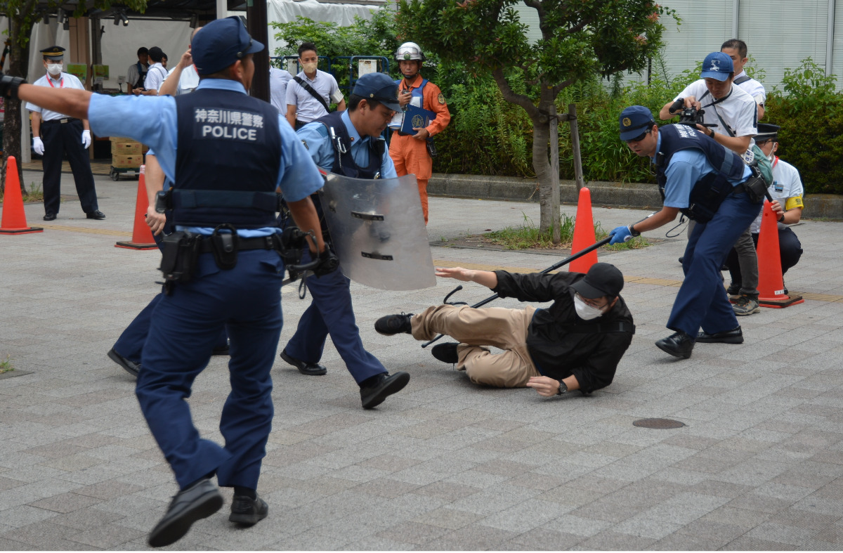 大規模テロを想定した合同訓練が8月8日、東急田園都市線・宮崎台駅構内とその周辺で実施された。宮前消防署と宮前警察署、東急電鉄、宮前区役所から54人が参加。情報伝達から犯人制圧、負傷者の救出までを訓練した。