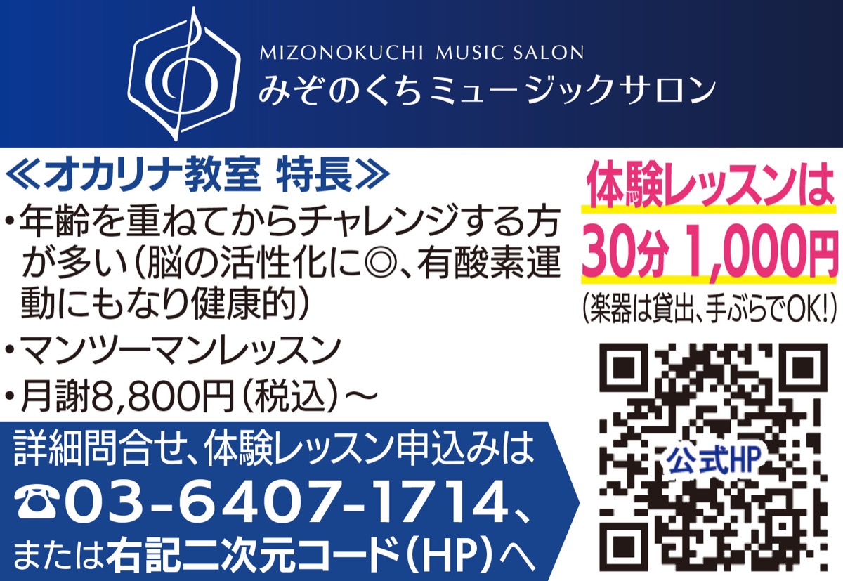 あたたかい音色が特長的なオカリナと同様、優しく丁寧なレッスンを標榜しており「(オカリナは)楽譜が読めなくても大丈夫なので、ぜひ始めてみませんか?」と、まずは「体験レッスン」(30分1000円)への参加を呼び掛けている。
