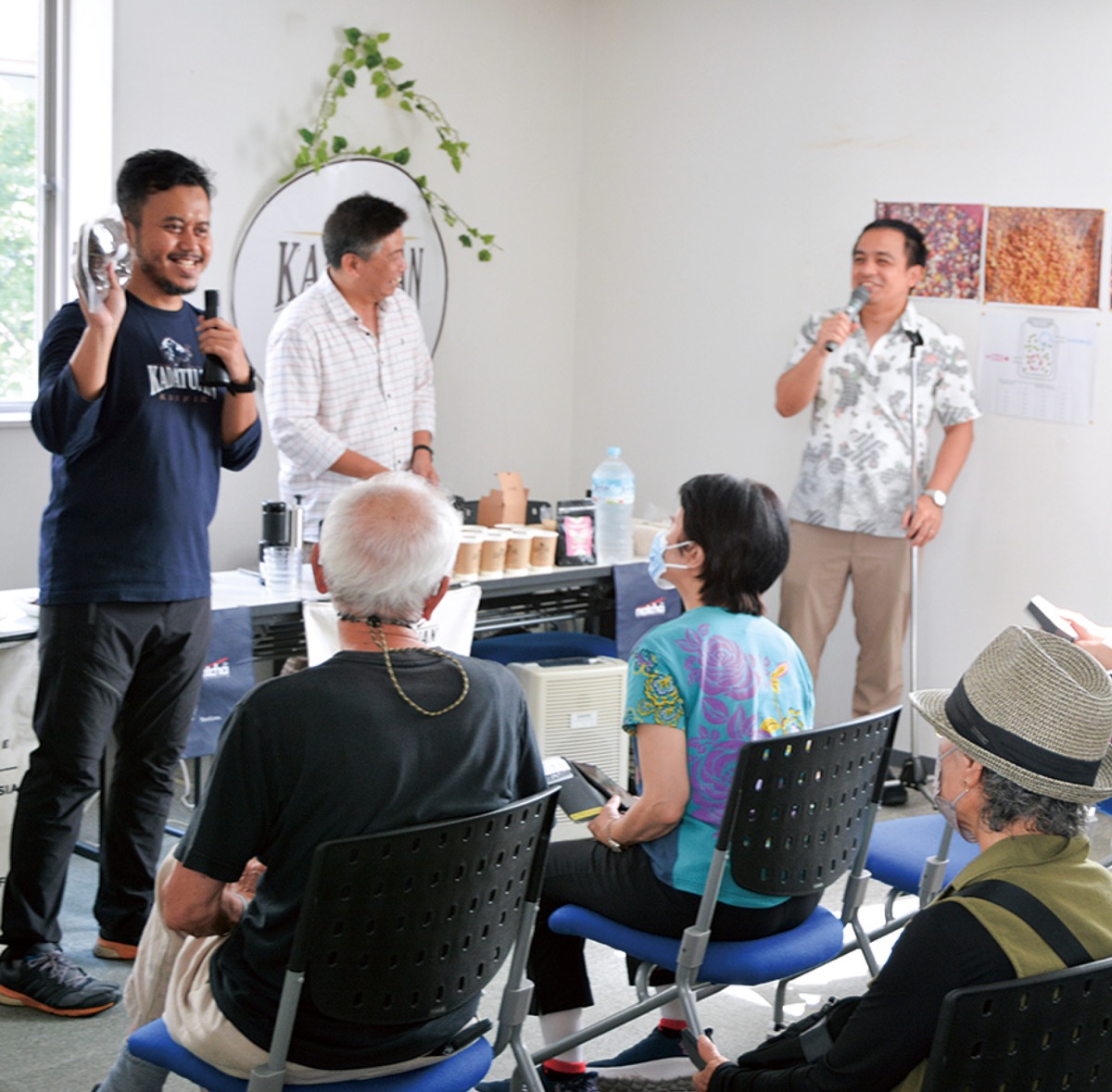 インドネシアのアンバサダー(経済協力部門)でもある馬場さんが、テガルさんの来日に合わせて企画。テガルさんは集まった市民らを前に「精製方法によってさまざまな味を表現できる」と説明し、伝統的な豆や微生物を活用した豆などでコーヒーをいれて、飲み比べ会を行った。