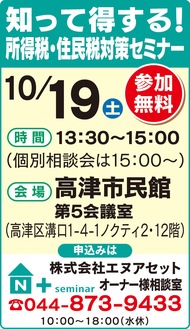 賃貸経営では、税金対策をしていないと「所得税が高い…」と負担になることも。高津区の不動産会社「(株)エヌアセット」は10月19日(土)、賃貸不動産オーナー向けに「知って得する!所得税・住民税対策セミナー」を開催する。