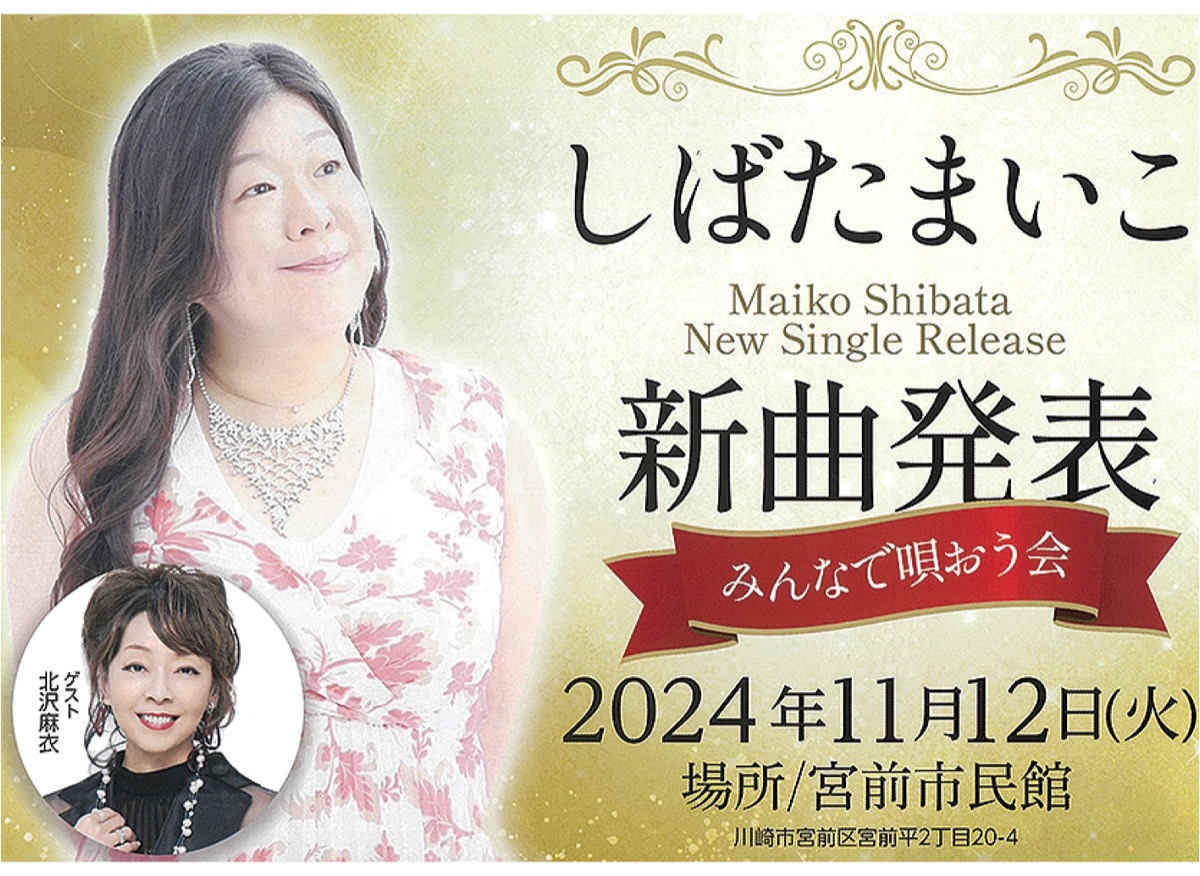 宮前区内在住の歌手・しばたまいこさんの新曲発表が11月12日(火)、宮前市民館で行われる。