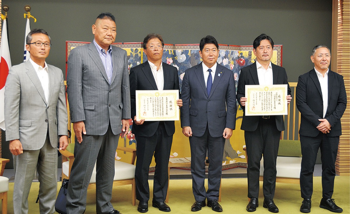 能登半島地震の水道施設の応急復旧活動を行った功績をたたえ、(一社)川崎建設業協会(山根崇会長)と矢島建設工業(株)(多摩区/矢島秀一社長)に9月25日、福田紀彦市長から感謝状が贈呈された。
