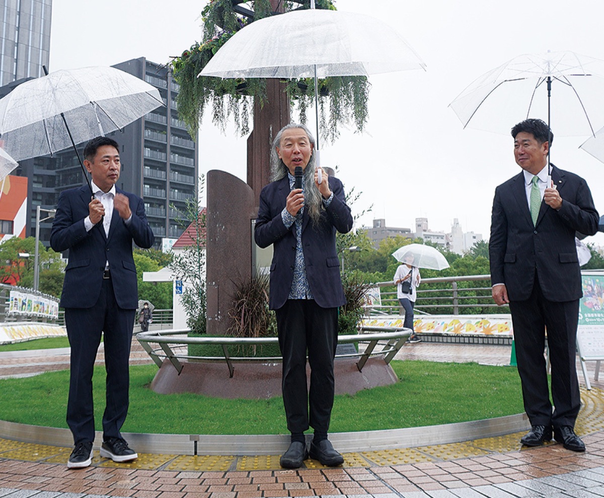 間もなく開幕する「全国都市緑化かわさきフェア」に向け、フェアのメイン会場・富士見公園までのルートに位置する歩道橋「川崎ハローブリッジ」(川崎区)で、芝生による緑化実験が始まった。10月8日に芝生のお披露目イベントがあり、フェアの「花の応援ボランティア応援団長」を務める華道家の假屋崎省吾さんらが出席した。