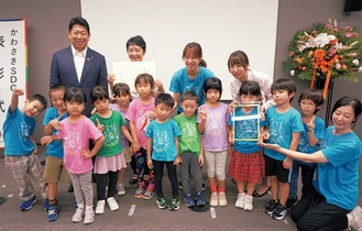 レイモンド元住吉保育園では、園内で子どもたちが野菜栽培を始め、野菜を育てながら「一人一人に何ができるか」を考えながら、ゴミを減らす工夫や古着の寄付などを続けている。年長の園児ら12人と共に授賞式に臨んだ松村晴子園長は、「未来を担う子どもたちに、SDGsなどに対する意識づけができるように取り組んでいる。このような評価を頂けてうれしい」と喜びを語った。