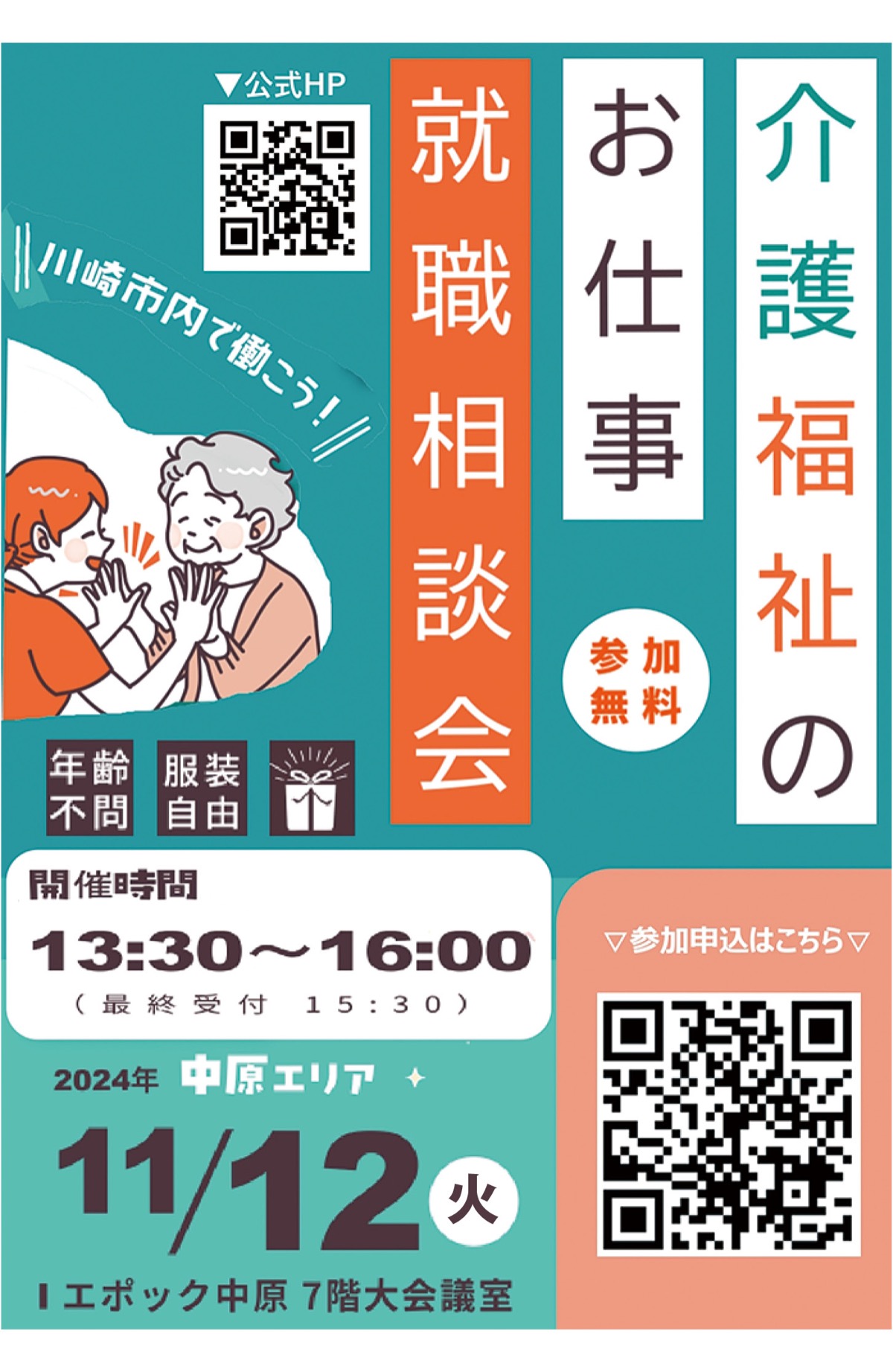 介護の仕事に興味のある人へ向けて、事業所の担当者に話を聞ける、相談会が開催される。11月12日(火)13時30分〜16時。資格の有無・年齢・国籍問わず参加可。「介護職員初任者研修」等の受講について相談可能。会場はエポックなかはら7F大会議室。予約なしでも参加可。川崎市では、介護資格の取得から就職までサポートする「川崎市介護人材確保事業」を実施。介護職を目指す人へ、初任者研修の受講が無料の上、15日間で取得可能。就職まで親身にサポート。研修は12月「武蔵新城校」で開催。申込は、電話またはQRから。詳細は、川崎市介護人材確保事業事務局【フリーダイヤル】0120・510・441((株)シグマスタッフ)