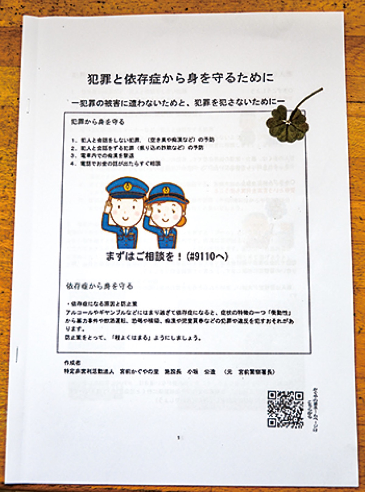 抜け出す方法の一つは、依存症の怖さを知ることです。依存症の怖さを知った人は罪を犯したくないので、はまっている依存から抜け出そうとするかも知れない、そんな思いから冊子「犯罪と依存症から身を守るために」を作成、蓮花と菜の花の種を添付して施設のほか、アリーノ、向丘出張所、福祉パルなどで無料配布しています。(施設長/元宮前警察署署長・小坂公造)