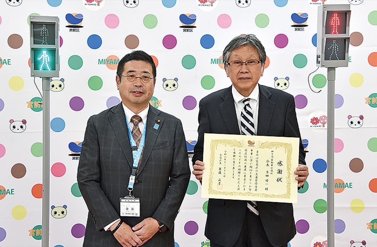 宮前区は11月13日、交通安全教室用の信号機2基を寄贈した(一社)神奈川県自動車会議所に感謝状を贈った。齋藤正孝区長から勝亦政幸事務局長へ手渡した。