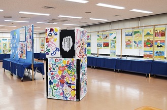 作品は、宮前地区在住・在学の小中学生による絵画・ちぎり絵・イラストデザイン・書道条幅・書道半紙の作品で、253点の力作が集まった=写真。