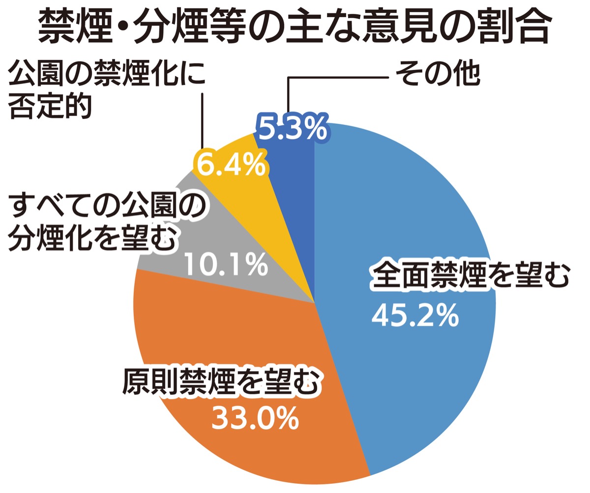 そのうえで方針案に対するパブコメを9月10日から10月10日まで実施した結果、市民からの意見188通のうち、市の方針より厳しい「全面禁煙を望む」意見が全体の45・2%を占める結果となった。市の方針と合致する「原則禁煙を望む」意見は10ポイント以上低い33%だった。一方、公園を禁煙とすることに否定的な意見は12通で6・4%だった。