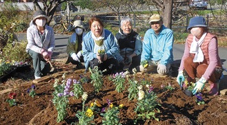 平瀬川流域まちづくり協議会の有志たちが11月24日、平瀬川の蔵敷親水広場近くの花壇に、パンジーとストックの苗を約50鉢植えた=写真。