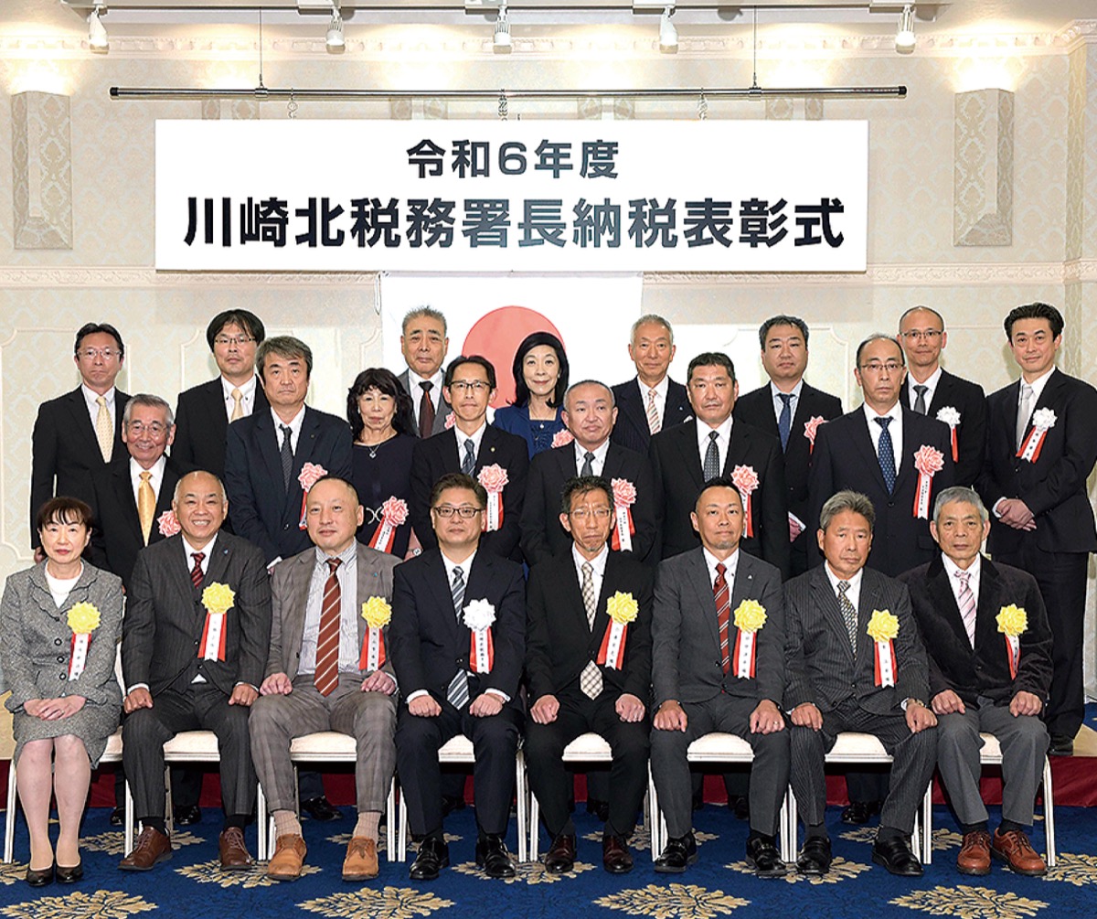 川崎北税務署(荒井寿宏署長)は11月14日、中原区内のホテルで今年度の納税表彰式を開催した。毎年、国税申告や納税等の高揚に貢献のあった人や税務行政の推進に功績のあった人を表彰しており、今年は12人に表彰状や感謝状が贈られた。このほか中学生の税についての作文の表彰もあり、2人が受賞した。