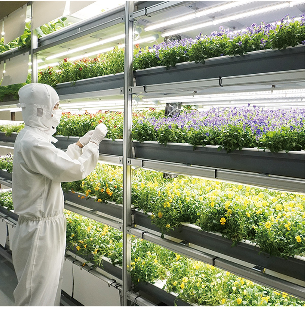 エディブルフラワーの栽培方法は様々だが、森さんは専門の業者から、花のタネから養液、栽培機材や栽培ノウハウまでをパッケージで購入した。農地の一角に建てた栽培施設(約36㎡)内に機材を導入。温度や湿度、二酸化炭素濃度などを制御した状態で、5色のビオラとアリッサムなどのエディブルフラワーと、バジルなどのハーブを栽培している。