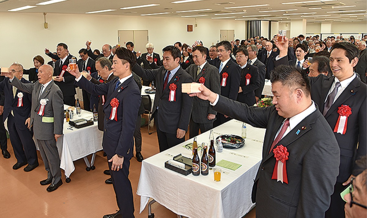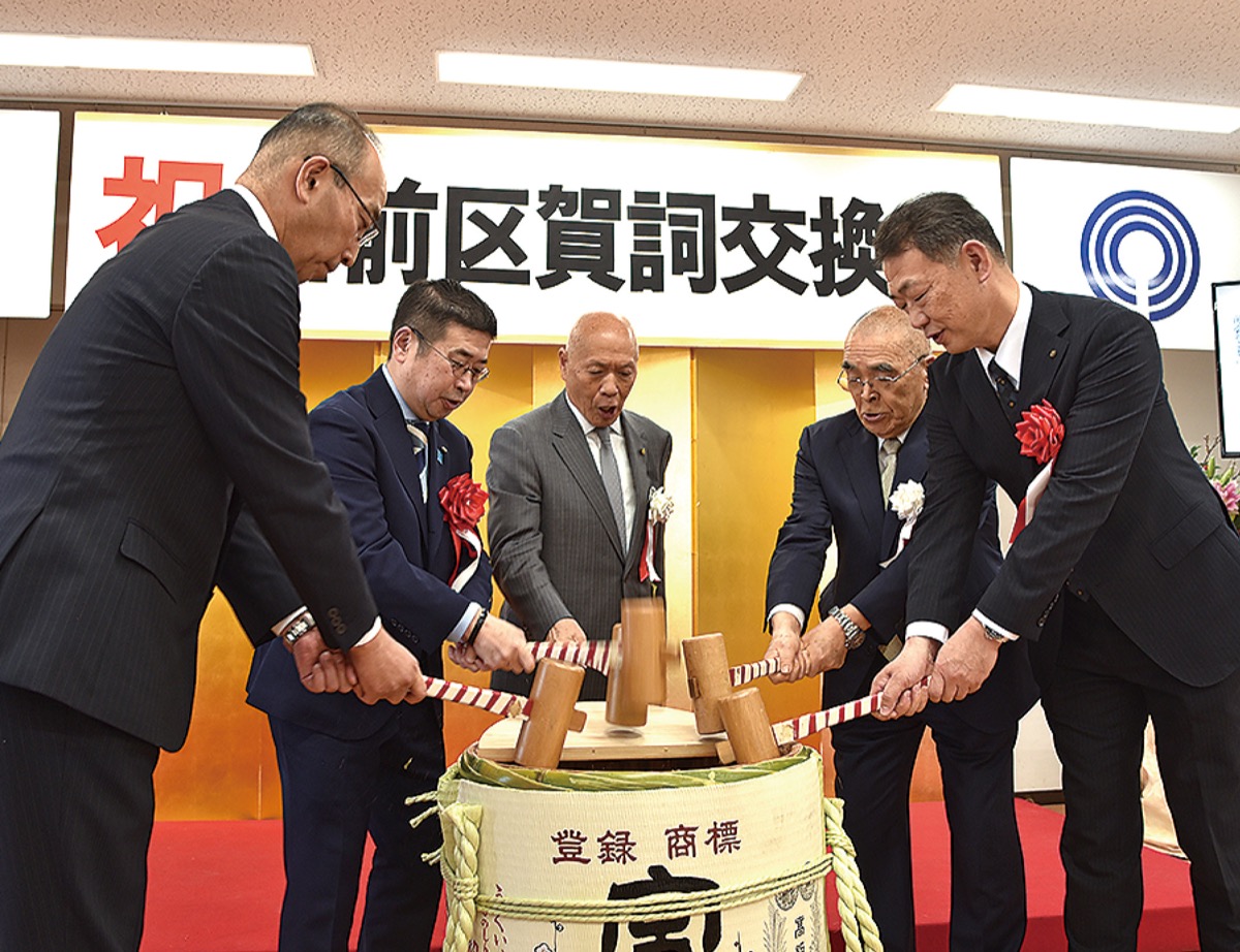 宮前区全町内会・自治会連合会(持田和夫会長)と宮前区社会福祉協議会(浮岳堯仁会長)からなる宮前区賀詞交換会発起人会が主催。新年のあいさつや参加者同士の交流を深めようと、会場には宮前区選出議員や区内団体関係者ら約140人が出席。代表者による鏡開きが行われ、乾杯とともに宴会がスタート。出席者らは近況を報告し合うなど、交流を深めた。
