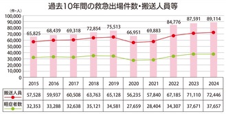 市内の救急出場件数は、6万6951件だった20年から5年連続で増加。24年は8万9114件で、前年よりも1523件増で過去最多だった。1日平均で見ると、243・5件で約5分54秒に1件の割合で救急出場したことになる。搬送人員は、7万2446人で前年比1336人増で、過去最多。年齢別では、65歳以上が前年よりも1・9ポイント増の57・7%で、成人(18歳〜64歳)、少年(7歳〜18歳未満)、乳幼児(7歳未満)はそれぞれ前年よりも減少している。